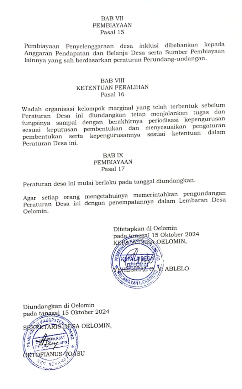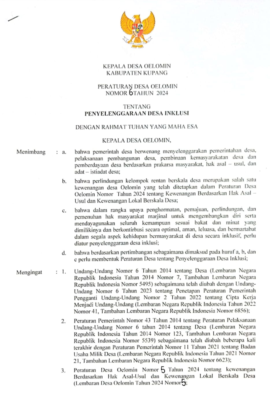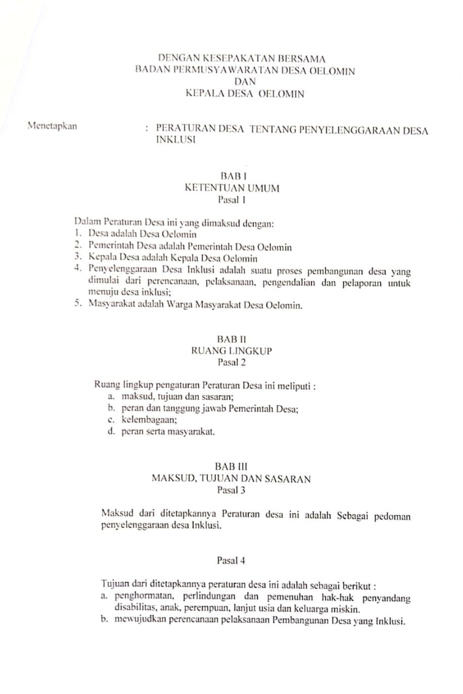 Dokumentasi Perdes Inklusi Desa Oelomin dalam bentuk visual.